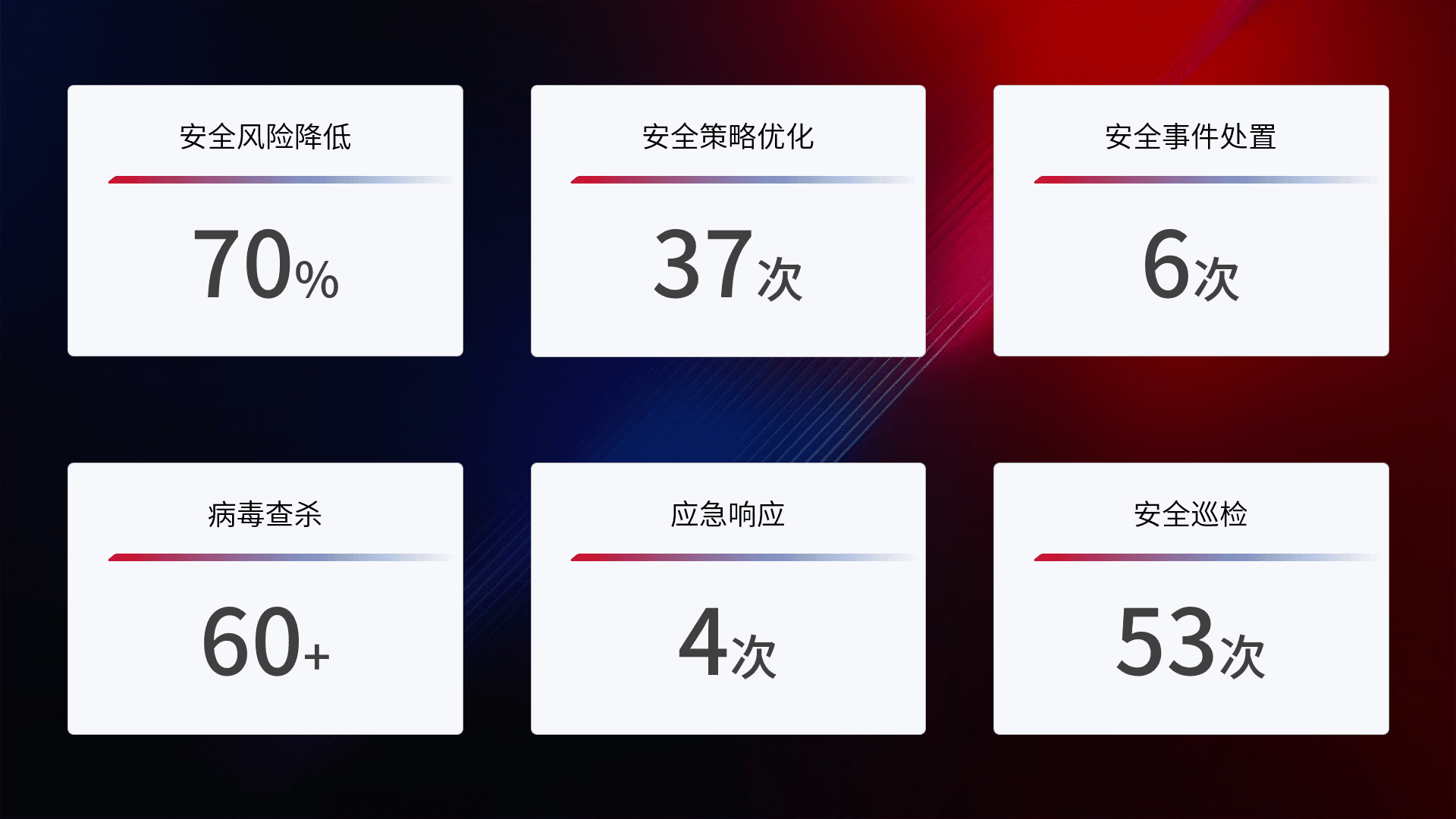 提供全面的安全事件报告体系,,,,包括处置报告、、、周报、、、、季度和年度总结,,,结合持续监控,,,帮助客户深入了解网络安全状况。。